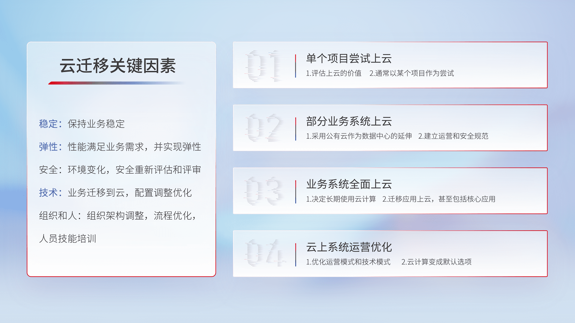 结合实际业务,,从规划设计、、、云平台选型、、、云原生改造、、数据迁移、、、、集成交付,,,迁移全过程为客户识别最佳上云路径,,做好风险识别管理,,,设计网络架构、、身份权限、、、安全审计合规、、操作审计、、日志审计、、监控告警策略、、、多站点容灾设计等,,,,对云上基础设施进行整体规划,,,,提升IT治理水平,,以满足弹性、、、、高可用、、、高性能的需求。。