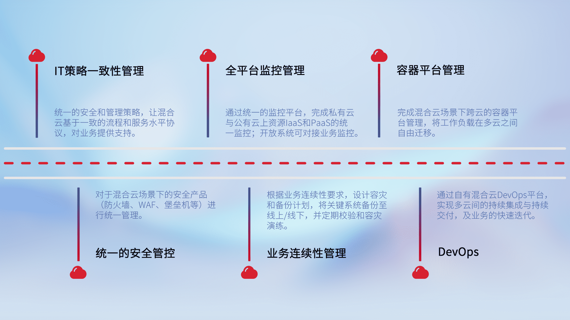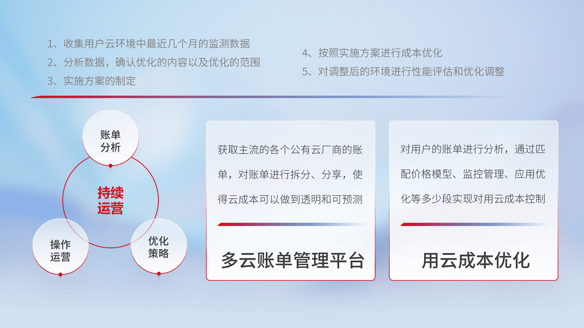 通过多云纳管,,以统一的资源数据模型把客户的云资源进行抽象和封装,,,,进而实现对多云资源的统一操作,,保障云资源管理的可靠性、、稳定性与可用性。。量身定制化运维内容,,,配置、、、开发运维、、、、补丁管理、、、备份、、监控、、认证和访问管理、、、审计和日常巡检等,,,保障在用云过程中的可靠度,,,,稳定度以及高可用率。。。。