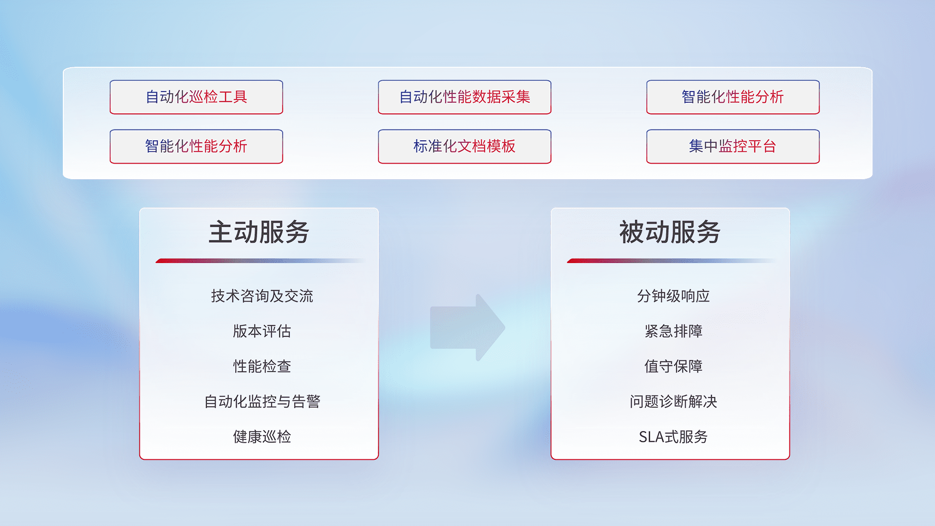 智能化工具和标准化文档,,,保障服务质量,,,提供主动服务(包含技术咨询、、版本评估、、、性能检查、、、自动化监控与告警、、、健康巡检)和被动服务包含(分钟级响应、、、紧急排障、、、值守保障、、、问题诊断解决、、、SLA服务)。。。。